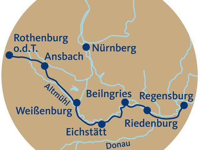Reiseverlauf:Reiseverlauf1. Tag: Anreise in Eigenregie nach Rothenburg o.d. Tauber. Individuelle Besichtigung der Stadt mit dem bekannten Riemenschneider-Altar und dem historischen Zentrum. Am Abend ist für Sie eine Weinprobe "liebliches Taubertal" in einem typischen Gasthaus in Rothenburg inkludiert. 2. Tag: Rothenburg - Ansbach (ca. 38 km). Ausgabe der Mieträder zwischen 8 und 9 Uhr (sofern gebucht). Heute radeln Sie zur Altmühlquelle. Weiter geht es vorbei an Burg Colmberg und weiter ins mittelalterliche Ansbach. Besichtigung der Hohenzollern-Residenz (zahlbar vor Ort). 3. Tag: Ansbach - Wettelsheim/Weißenburg (ca. 65 km). Heute fahren Sie zunächst zum Altmühlsee und weiter ins mittelalterliche Gunzenhausen. Danach führt Sie die Strecke durch das hier enger werdende Altmühltal bis zum Karlsgraben, der 793 n. Chr. als erster Versuch Karl des Großen, Rhein und Donau zu verbinden, gilt. Ihre Etappe endet in Wettelsheim und Weißenburg direkt im Naturpark Altmühltal gelegen. 4. Tag: Wettelsheim/Weißenburg - Eichstätt (ca. 49 km). Sie durchqueren den Naturpark Altmühltal und radeln in zahlreichen Windungen und Schleifen durch das wunderschöne Kerbtal in der Fränkischen Alb, bevor Sie die alte Bischofsstadt Eichstätt erreichen. 5. Tag: Eichstätt - Beilngries (ca. 44 km). Ihre heutige Radtour führt Sie entlang der Altmühl. Vorbei an Walting und Arnsberg und den Ferienort Kipfenberg (Burg, Ortsbild) führt Ihre Radtour nach Beilngries. 6. Tag: Beilngries - Kelheim (ca. 48 km). Der erste Streckenabschnitt führt Sie zunächst bis Dietfurt. Nehmen Sie sich einen Moment Zeit und entdecken Sie bei einem Stadtbummel die Wehrtürme der mittelalterlichen Stadtbefestigung, das Franziskanerkloster, die Wallfahrtskirche "Zu den Drei elenden Heiligen" oder die vielen einfallsreich gestalteten Brunnen, bevor Sie Ihr Tagesziel in Kelheim erreichen. 7. Tag: Kelheim - Regensburg (ca. 38 km). Ihre Tagesetappe führt Sie heute durch das Donautal, vorbei an Bad Abbach bis nach Regensburg. Es bleibt ausreichend Zeit die mittelalterliche Altstadt, den Dom St. Peter, die Steinerne Brücke, den Reichssaal im alten Rathaus oder den Goldenen Turm von Regensburg zu entdecken. 8. Tag: Individuelle Rückreise. Rücktransfer nach Rothenburg oder Verlängerung in Regensburg oder Rothenburg o.d. Tauber möglich.