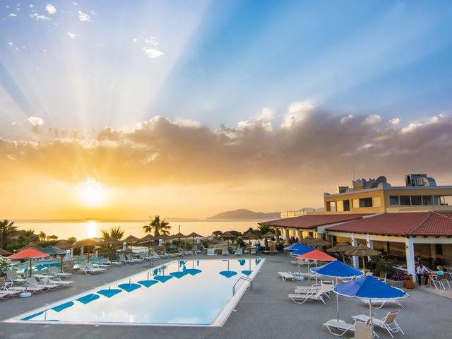 Genießen Sie die Ruhe und Abgeschiedenheit, planschen mit den Kindern im Pool und toben Sie auf dem Spielplatz und entspannen Sie auf der Sonnenterrasse: Für all dies ist das Kouros Palace Hotel die ideale Urlaubsunterkunft. Sie wohnen im Nordwesten von Kos, wenige hundert Meter vom Strand entfernt und nur 6km nördlich des internationalen Flughafens der Insel. Viele flache Bungalows erstrecken sich auf dem weitläufigen Hotelgelände, in denen sich die 216 Zimmer und Juniorsuiten verteilen. Griechische Gastfreundschaft und vor allem landestypische Speisen zeichnen das Buffetrestaurant und das abendlich geöffnete À-la-carte-Restaurant aus. Entscheiden Sie sich für das Zimmer oder die Juniorsuite Ihrer Wahl und buchen Sie bei sonnenklar.TV den Aufenthalt im Kouros Palace Hotel.