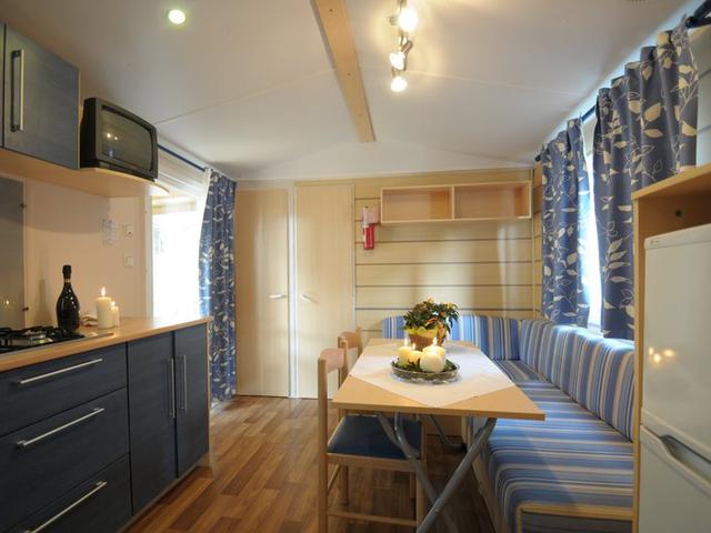 Zimmerbeschreibung: Das Mobilheim A verfügt über ein Wohnzimmer mit bequemer französischer Schlafcouch und einer modernen vollständig ausgestatteten Kochnische, sowie Kühlschrank. Es verfügt über ein Bad mit Dusche, Waschbecken und WC. Das Mobilheim ist ausgestattet mit zwei Schlafzimmern (davon eines mit Doppelbett und das andere mit Einzelbetten bzw. Stockbetten), einem Tisch und Stühlen, einem Fernseher und einer Klimaanlage.