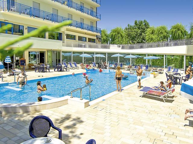 Ausstattung: Urlaubshotel mit 2 Gebäuden (durch gläsernen Gang verbunden), mit Rezeption, Restaurant, Bar mit Terrasse. Im Außenbereich Swimmingpool (ca. Mai-Sept.) mit Hydromassage, Sonnenterrassen (Liegen inkl.). Strandservice (2 Liegestühle, 1 Schirm, ca. 15.05.-15.09.) inklusive. Parkplatz (nach Verfügbarkeit). Landeskat.: 3 Sterne, 88 Zimmer, 4 Etagen, Lifte.