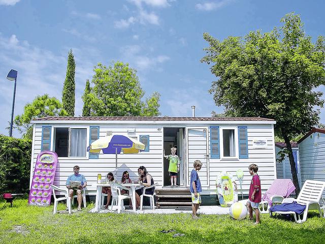 Wohnen: Mobilehomes (MH6, ca. 25 qm), Happy Easy, Wohn-/Schlafraum mit Schlafbank, 2 sep. Schlafzimmer (1x mit Doppelbett, 1x mit 2 Einzelbetten, 1 Klappbett für Kinder bis 1,50 m/60 kg), Klimaanlage (inklusive), Küchenzeile. Dusche, WC. Halb überdachte Terrasse mit Gartenmöbeln, kleiner Elektrogrill. Max. 5E+1K