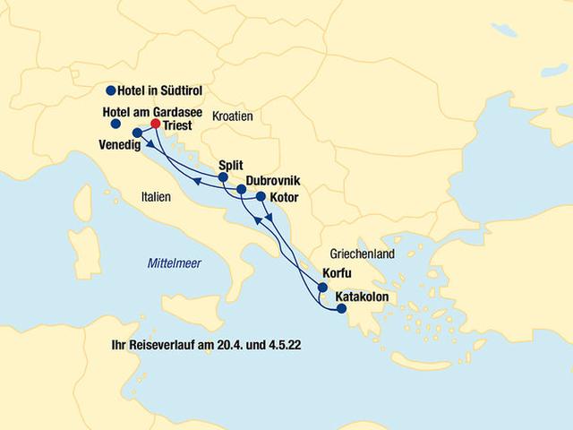 Ihre Kreuzfahrt beginnt in der italienischen Hafenstadt Triest. Begeben Sie sich auf eine spannende Reise auf der kristallklaren, blauen Adria und im östlichen Mittelmeer inmitten vieler toller Inseln, traumhafter Landschaften und kultureller Highlights. Entdecken Sie dabei kulturell faszinierende Städte wie Dubrovnik mit der seit 1979 zum UNESCO-Weltkulturerbe gehörenden Stadtmauer und malerische Orte wie Kotor oder die Insel Korfu. Wahlweise genießen Sie vor oder nach Ihrer Kreuzfahrt 3 entspannte Tage in Südtirol oder am Gardasee.