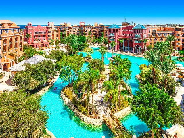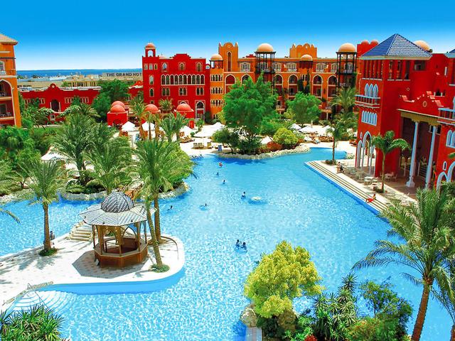 Mit 5-Sterne-Komfort laut Landeskategorie und einer Architektur wie aus 1001 Nacht heißt Sie das Grand Resort im ägyptischen Hurghada herzlich willkommen. Den Gast erwarten erholsame Tage im ägyptischen Hurghada. Vom ersten Urlaubsmoment an erlebt man den hohen Standard überall in der Anlage. Der elegante Empfangsbereich bietet Sitzgelegenheiten, einen Safe und WLAN. Das freundliche Personal an der Rezeption ist 24 Stunden am Tag für Sie da. Fahrstühle fahren in die oberen Etagen. Über das großzügige Areal verteilt findet der Gast viele verschiedene Bars und Restaurants, die köstliche lokale und internationale Speisen und Getränke anbieten. Absolutes Highlight im Grand Resort ist der herrliche Palmengarten mit seiner lagunenartig angelegten Poolwelt (inkl. Kinderpool), der mit Sonnenterrassen, Wasserspielen, malerischen Brücken, Liegen und Sonnenschirmen (ohne Gebühr) unvergessliche Ferienmomente verspricht. Am Abend erstrahlen die Torbögen, Palmen und Pools des Grand Resorts in einem ganz besonderen, romantischen Licht.